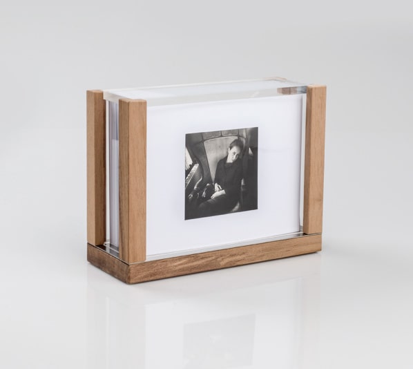 Picture display only made in small size. The wooden structure supports the 1cm thick plexiglass sides. The base is covered in satin stainless steel. Contains 30 white cards